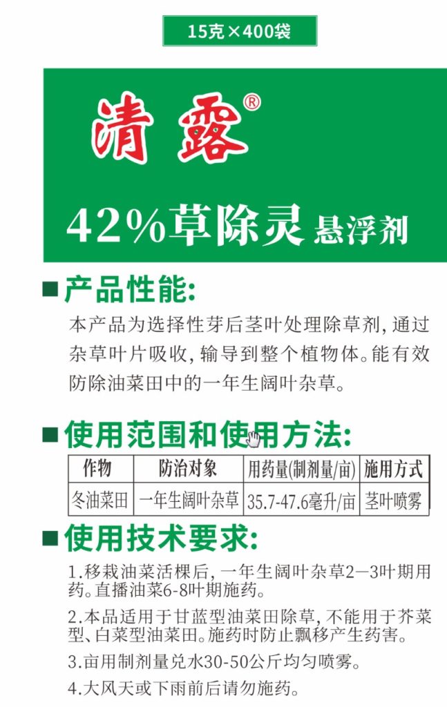 [使用技術(shù)要求]1.移栽油菜活棵后,一年生闊葉雜草2-3葉期用藥。直播油菜6-8葉期施藥。2.本品適用于甘藍(lán)型油菜田除草,不能用于芥菜型、白菜型油菜田。施藥時(shí)防止飄移產(chǎn)生藥害。3.畝用制劑量?jī)端?0—50公斤均勻噴霧。4.大風(fēng)天或下雨前后請(qǐng)勿施藥。5.油菜每個(gè)生產(chǎn)周期最多使用1次。